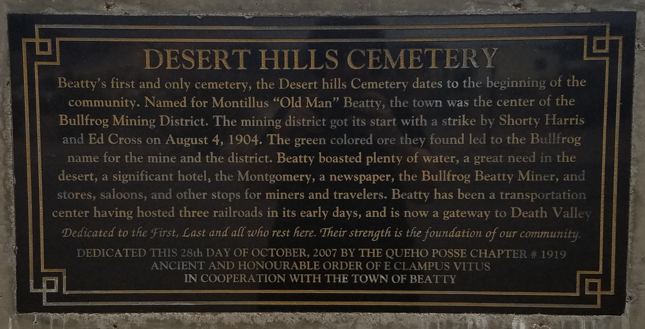 Beatty's first and only cemetery, the Desert Hills Cemetery dates back to the beginning of the community. Named for Montillus "Old Man" Beatty, the town was the center of the Bullfrog Mining District. The mining district got its start with a strike bt Shorty Harris and Ed Cross on August 4, 1904. The green colored ore they found led to the Bullfrog name for the mine and the district. Beatty boasted plenty of water, a great need in the deset, a significant hotel, the Montgomery, a newspaper, the Bullfrog Beatty Miner, and stores, saloons, and other stops for miners and travelers. Beatty has been a transportation center having hosted three railroads in its eary days, and is now a gateway to Death Valley.