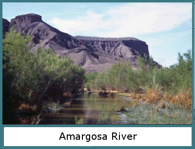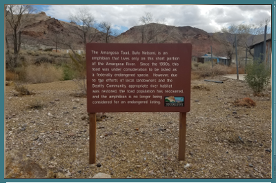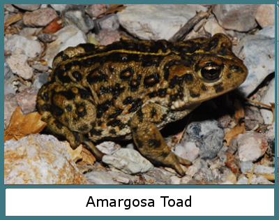 The Amargosa Toad is unique to the Oasis Valley and Beatty area. It is found in the Amargosa River, and in the seeps and springs in the foothills along the river valley. The Amargosa River is the longest underground river in the world; the headwaters are in the north end of Oasis Valley and winds south through Beatty, then (mostly underground) through Amargosa Valley. It surfaces again in Ash Meadows Wildlife Refuge, Shoshone and Tecopah, Californiia, then ends in the south end of Death Valley, California.