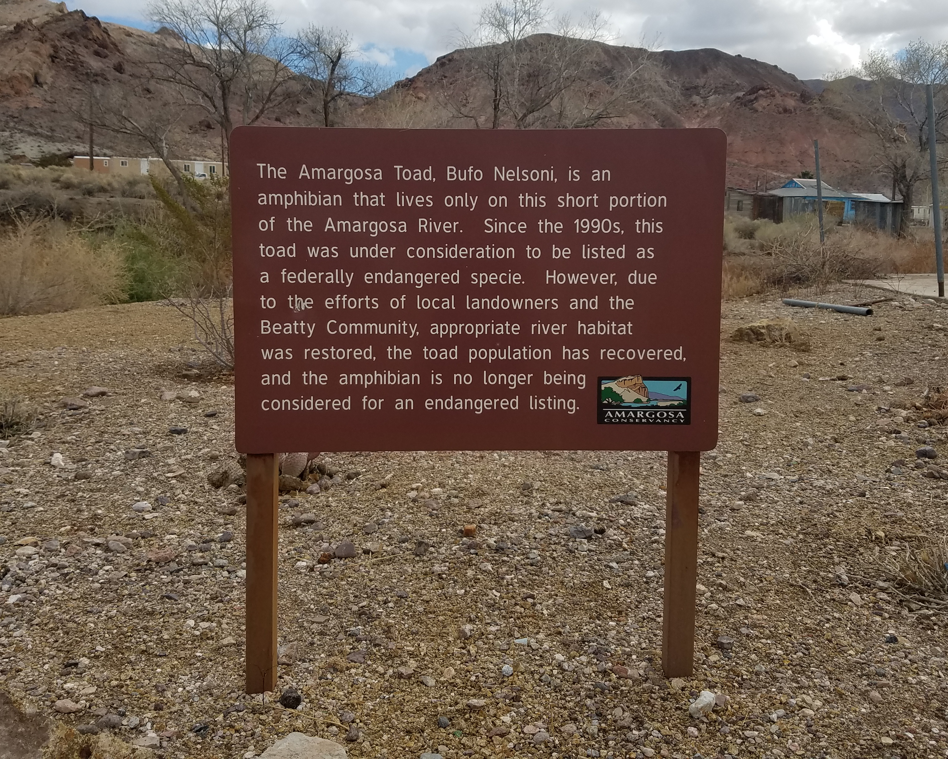 The springs and wetlands through the Oasis Valley and Beatty are ideal for the survival of the Amargosa Toad and other flora and fauna, native or unique to the area. This is also a "flyway" for migrating birds, and is the nesting-ground for numerous seasonal and year around resident birds.