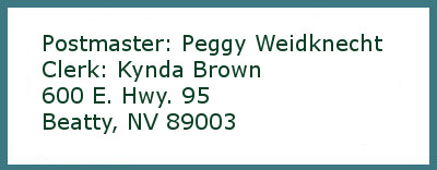Hello! As many of you may have noticed, the local Post Office has a new Postmaster and Clerk. I am the new Postmaster and my name in Peggy Weidknecht (Wide Neck). I live in Amargosa Valley and travel daily to work in Beatty. My husband, Art and I have a home in Amargosa and will not be moving to your lovely community, but I intend to be a familiar sight at as many functions as possible.